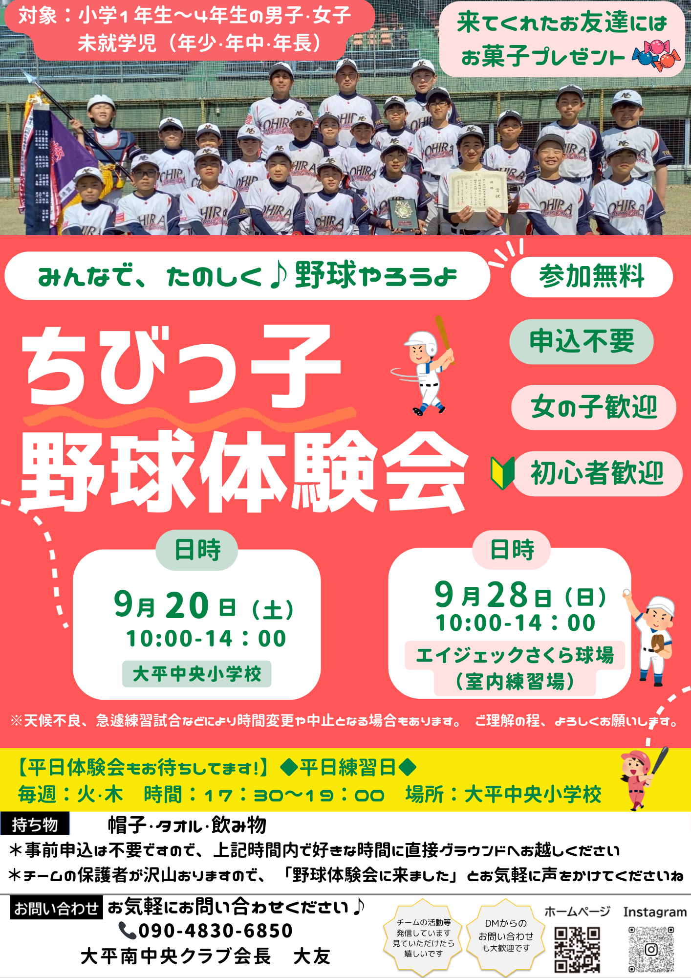 体験会では、バットにボールがあたる楽しさ、仲間と声を掛け合うワクワク感を、ぜひお子さんに味わってもらいたいと思っています。